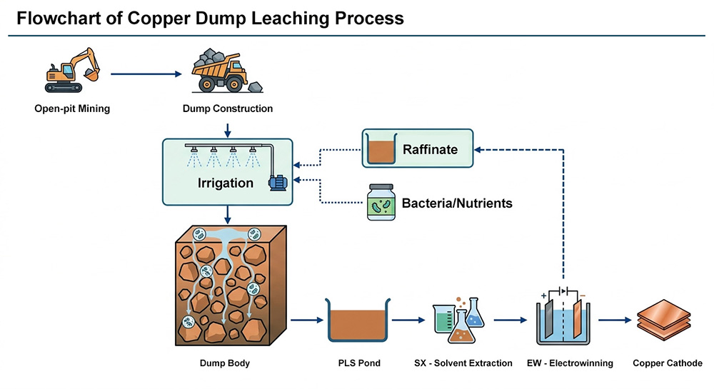 Collection: The "Pregnant Leach Solution" (PLS)—now rich in copper—seeps to the bottom of the dump, where it is captured by a liner system and pumped to a Solvent Extraction (SX) and Electrowinning (EW) plant to produce 99.9% pure copper cathodes.